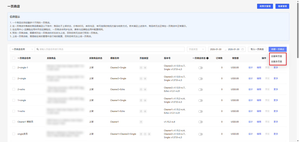 - 点击右上角【创建一页商店】按钮,在弹出选项中选择【创建多页面】。