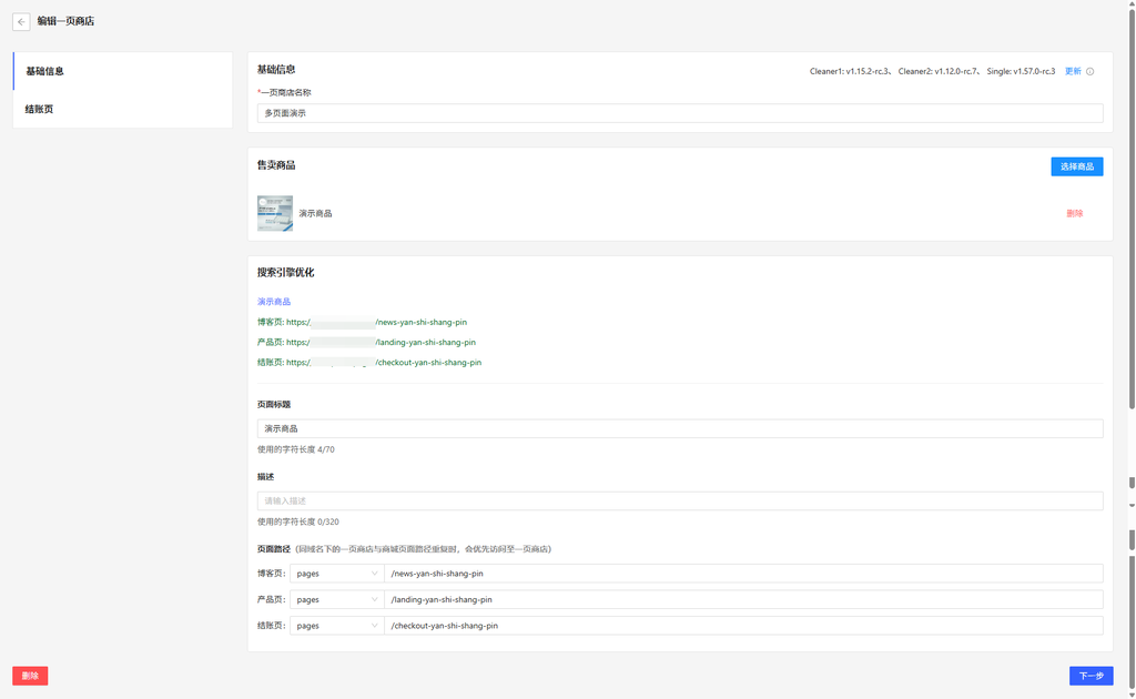 | 搜索引擎优化 | 系统根据商品自动生成多个页面的路径(博客页news-、产品页landing-、结账页checkout-前缀),可根据需求自行修改。 |