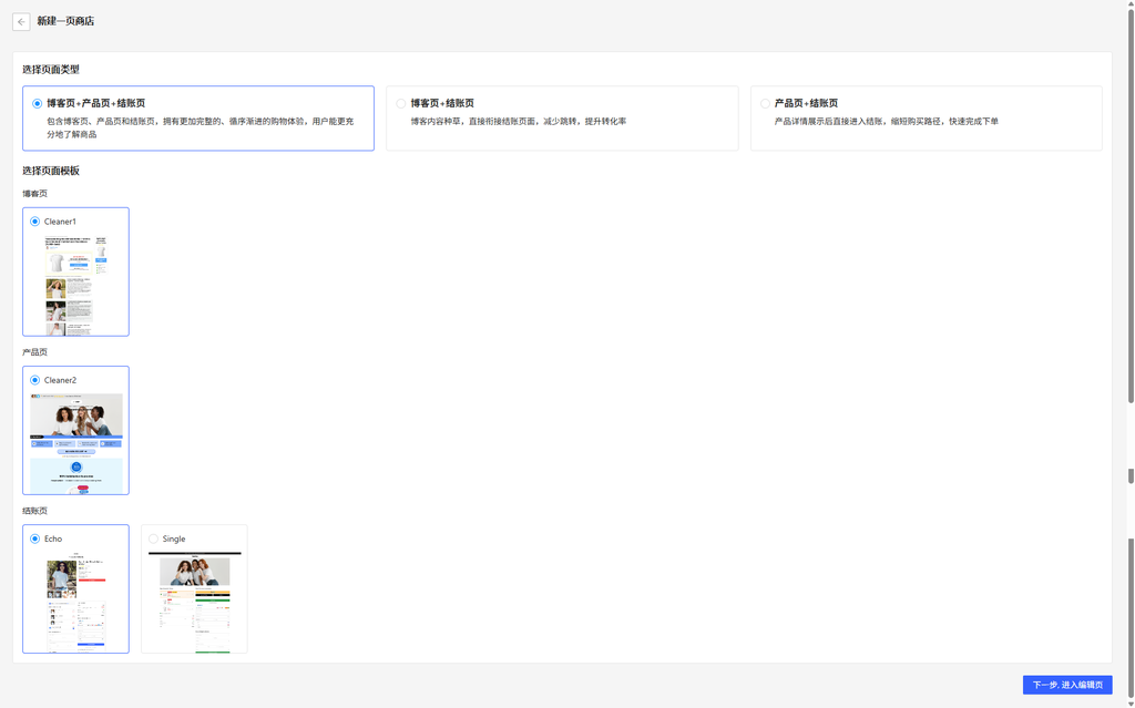 - 确认选择后,点击【下一步,进入编辑页】(此时尚未创建一页商店,需完成编辑页配置后才正式创建)。